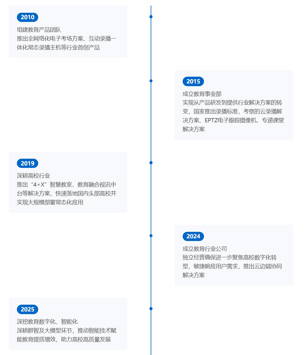 公司简介 苏州海舟智能科技有限公司(以下简称“海舟智能”)是由苏州科达科技股份有限公司(股票代码:603660)孵化的独立教育行业公司,前身为苏州科达教育事业部。公司名称“海舟”寓意“学海无涯苦作舟”,象征着在教育数字化事业的海洋中不断探索和进取的精神。 海舟智能是国内领先的高校数字化与智能化转型解决方案提供商,致力于赋能高等教育高质量发展。公司在音视频采集、处理及 AI 分析领域深耕多年,形成了“云、边、端”协作一体化的产品与解决方案矩阵。 发展历程